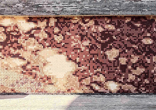 Landscape is a large ceramic tile mural cladding a thirty metre long by four metre fifty centimetre high exterior wall of a recently finished head office and factory building in the city of Dehua, Fujian Province in the south of China. The mural is realised using twenty three thousand individuallyl handmade and hued tiles which combine together to create both a practical exterior for this part of the building as well as a landscape image, the form of which appears somewhat undefined when observed from close by but when viewed from distance becomes clearly visible. The wall for which the mural was created was designed by the architect specifically to carry some form of adornment; adornment which I deemed should complement the building and its surroundings as well as enrich the lives and experience of the people working here. The wall in question forms part of an open courtyard and runs adjacent to an exterior walkway leading from the main entrance of the building to its central section. The wall acts then both to signify the importance of this location as well as an invitation to enter the building. The form of the tiles was designed specifically for this project, each having a unique three dimensional relief to further enhance the overall design.